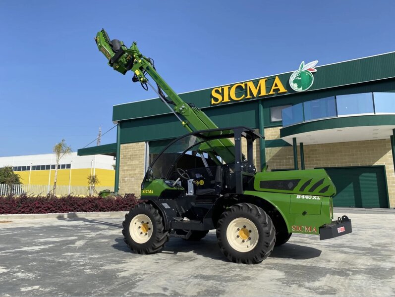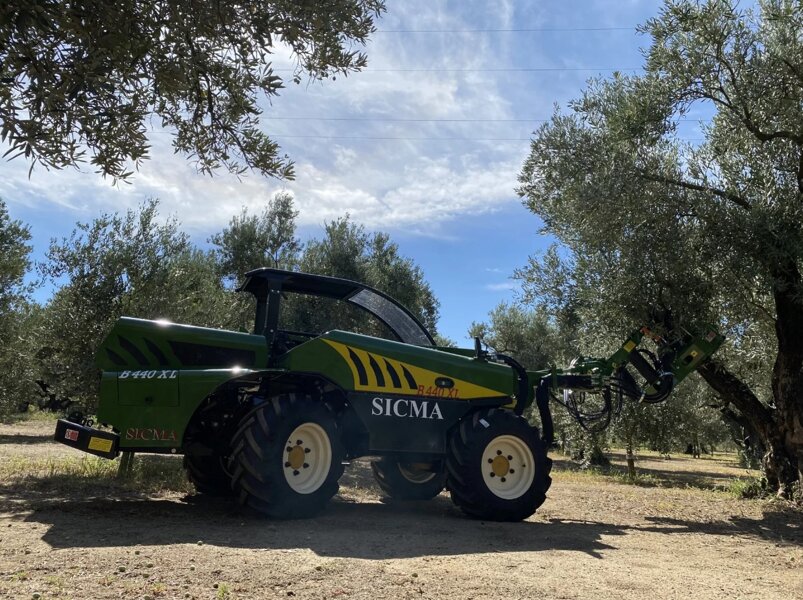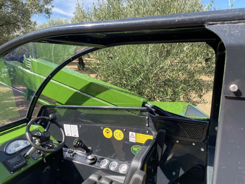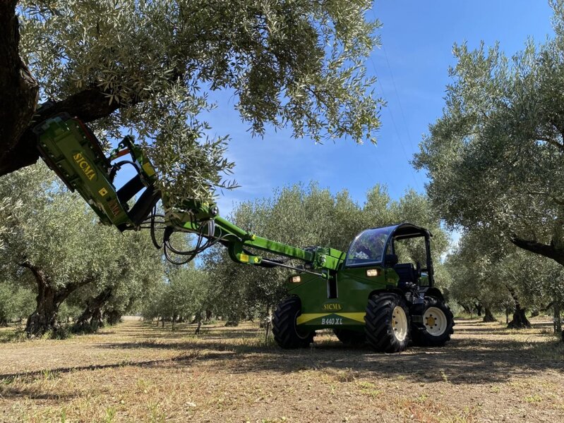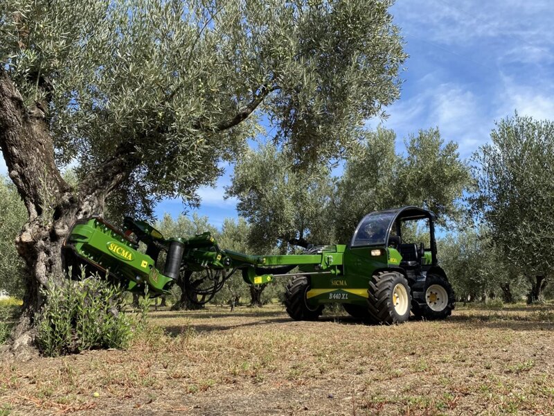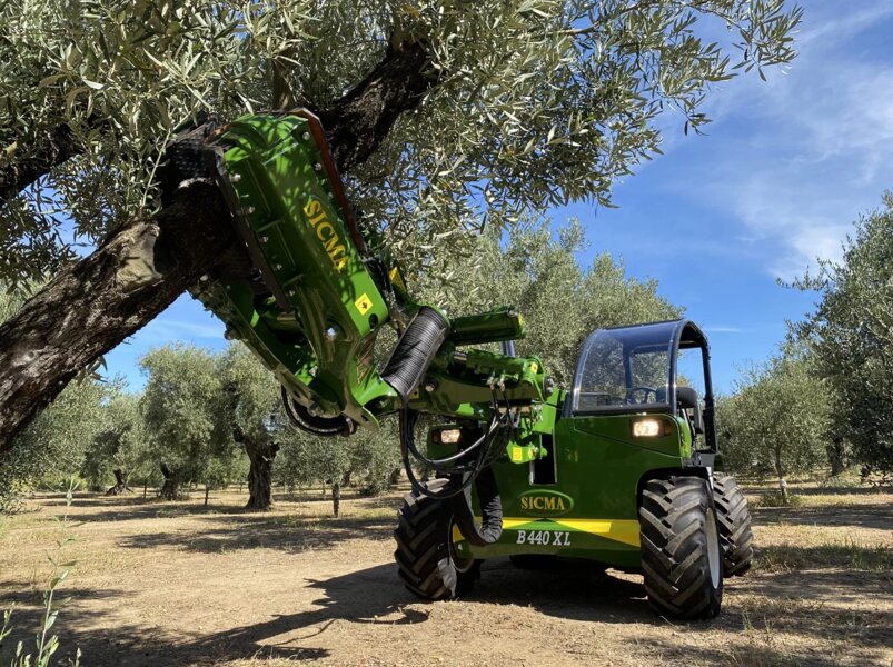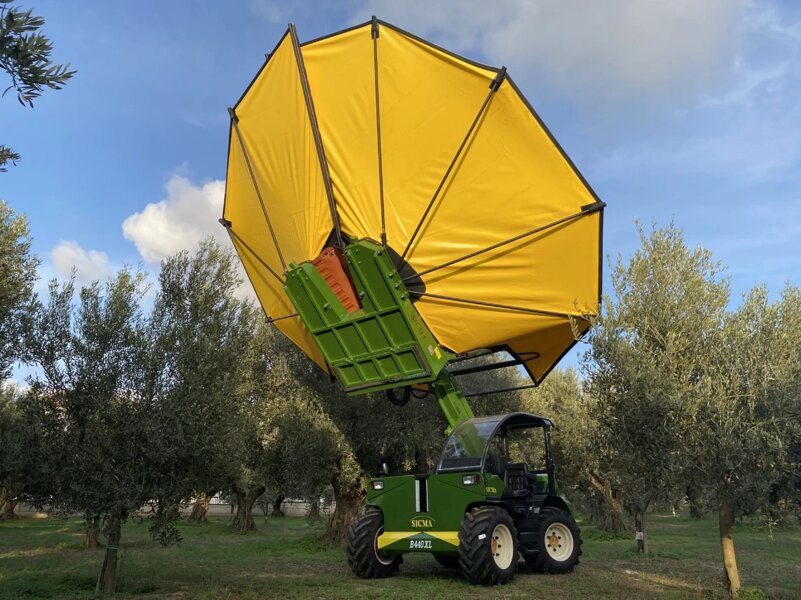 B440 XL è pensata per abbinare alle caratteristiche di compattezza ed agilità, versatilità e velocità, ideale (ma non solo) per la raccolta meccanica degli alberi di olive, mandorle, pistacchi o di frutti pendenti in genere, di dimensioni medie del tronco. La trazione integrale sulle 4 ruote, i pneumatici da 17’ ed il passo aumentato, le conferiscono maggiore stabilità, mentre i motori idraulici maggiorati delle ruote garantiscono un incremento della velocità su strada. Provvista di braccio telescopico, può lavorare con o senza ombrello rovescio, grazie al sistema a sgancio rapido. Il cassone dell’ombrello può contenere circa 250 kg di prodotto che si scarica tramite la botola sul fondo del cassone azionata idraulicamente. Finita la raccolta, la macchina può fungere da unità motrice da accoppiare ad una serie di accessori (es. forche).