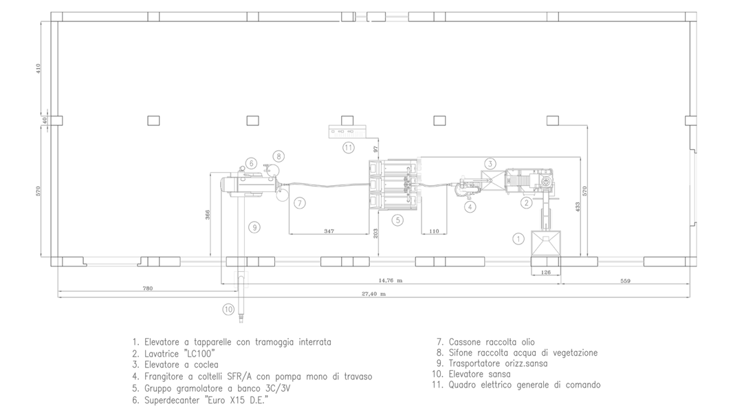 Questa soluzione impiantistica e’ completamente modulabile si possono variare la tipologie di gramole il frangitore o le lavatrici.
